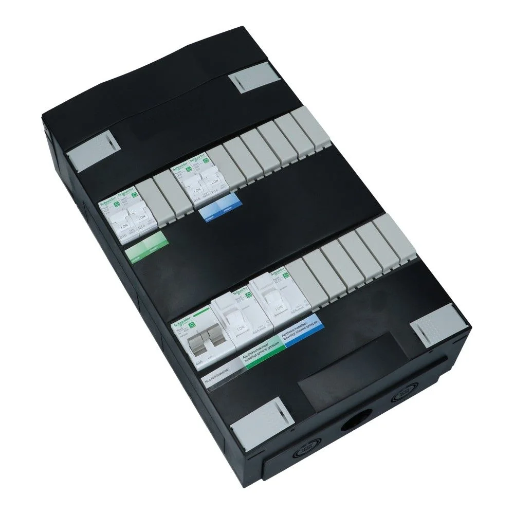 Verder kun je kiezen tussen een samengestelde stoppenkast, die voldoet aan de NEN1010 IEC/EN 61439-3 en al volledig bedraad, getest en CE gecertificeerd is, of een lege kast (behuizing) met losse componenten.