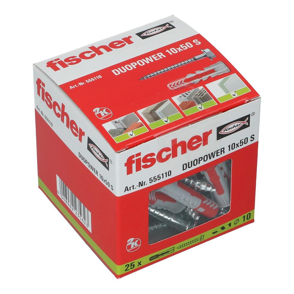 De fischer DUOPOWER heeft een zeer hoge bevestigingswaarde door de 2 componenten: De grijze component van kwalitatief hoogwaardig nylon activeert, afhankelijk van het bouwmateriaal, automatische het optimale werkingsprincipe (spreiden, tikken, knopen) voor het optimaal houvast. De expansievleugels van de rode component ondersteunen de betrouwbare spreiding en biedt extra veiligheid voor de grijze component. De schroef gewoon indraaien en tot slot goed „aantrekken“. De schroef niet de vast aandraaien. De bij de kop aangebrachte rand voorkomt, dat de plug in het boorgat glijdt.