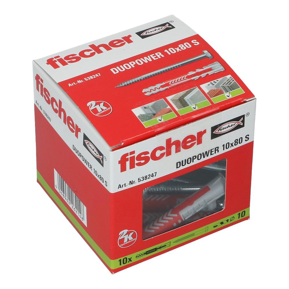 De fischer DUOPOWER heeft een zeer hoge bevestigingswaarde door de 2 componenten: De grijze component van kwalitatief hoogwaardig nylon activeert, afhankelijk van het bouwmateriaal, automatische het optimale werkingsprincipe (spreiden, tikken, knopen) voor het optimaal houvast. De expansievleugels van de rode component ondersteunen de betrouwbare spreiding en biedt extra veiligheid voor de grijze component. De schroef gewoon indraaien en tot slot goed „aantrekken“. De schroef niet de vast aandraaien. De bij de kop aangebrachte rand voorkomt, dat de plug in het boorgat glijdt.