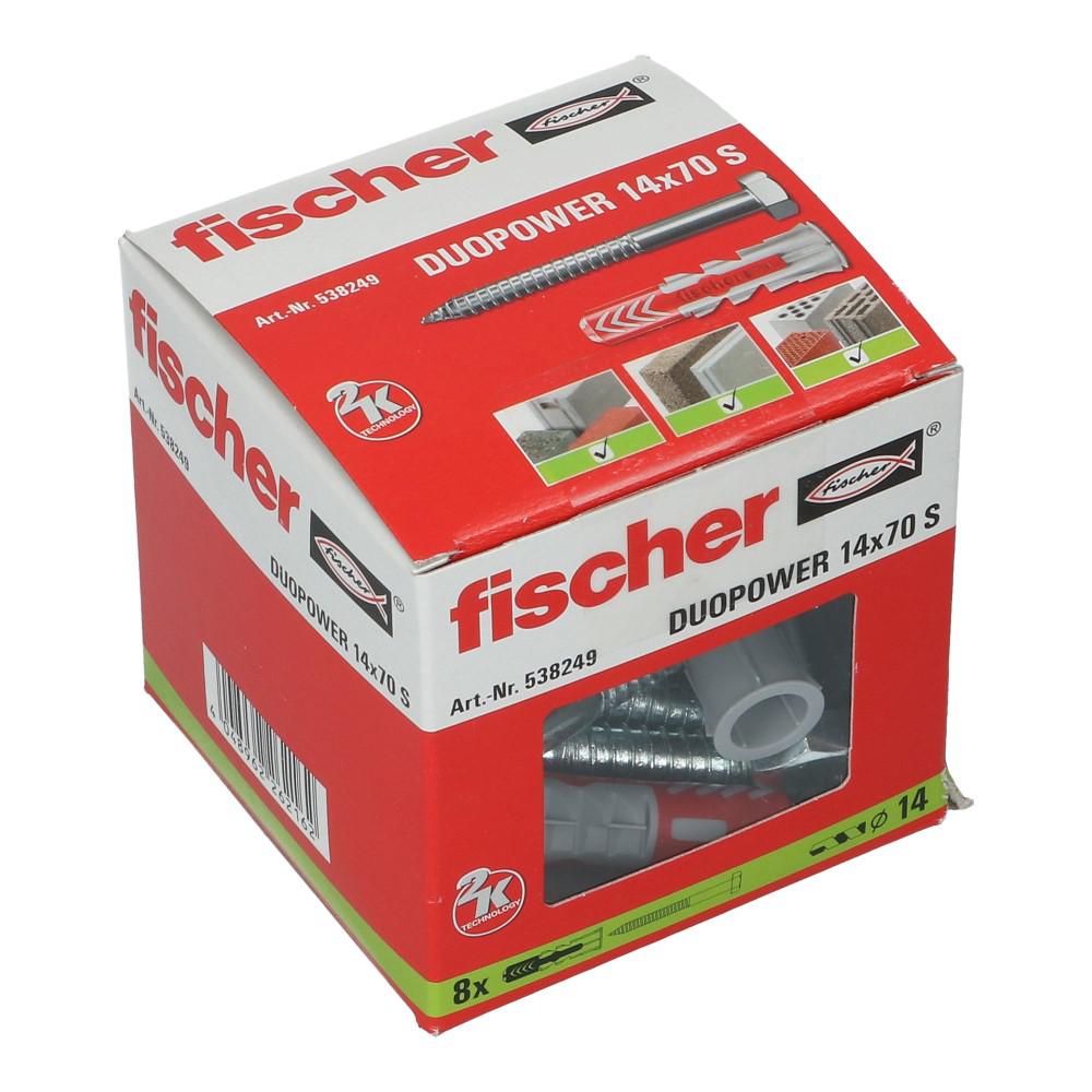 De fischer DUOPOWER heeft een zeer hoge bevestigingswaarde door de 2 componenten: De grijze component van kwalitatief hoogwaardig nylon activeert, afhankelijk van het bouwmateriaal, automatische het optimale werkingsprincipe (spreiden, tikken, knopen) voor het optimaal houvast. De expansievleugels van de rode component ondersteunen de betrouwbare spreiding en biedt extra veiligheid voor de grijze component. De schroef gewoon indraaien en tot slot goed „aantrekken“. De schroef niet de vast aandraaien. De bij de kop aangebrachte rand voorkomt, dat de plug in het boorgat glijdt.