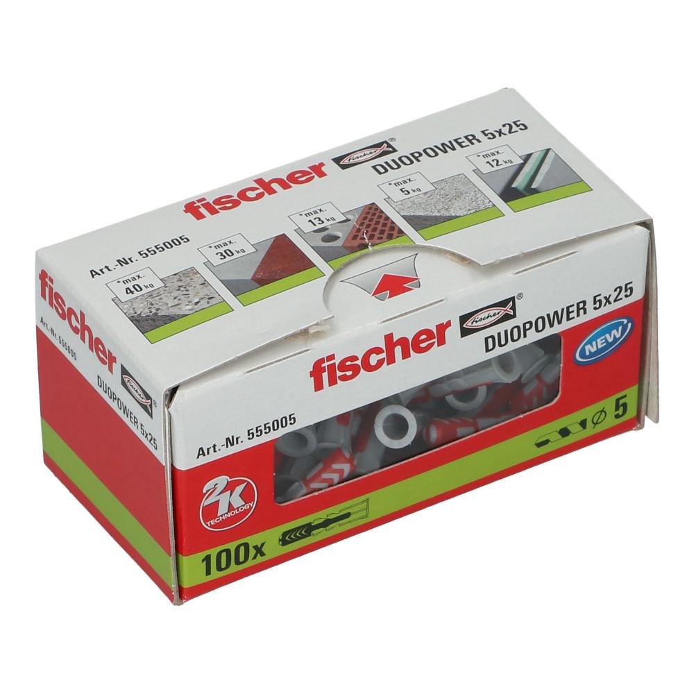 De fischer DUOPOWER heeft een zeer hoge bevestigingswaarde door de 2 componenten: De grijze component van kwalitatief hoogwaardig nylon activeert, afhankelijk van het bouwmateriaal, automatische het optimale werkingsprincipe (spreiden, tikken, knopen) voor het optimaal houvast. De expansievleugels van de rode component ondersteunen de betrouwbare spreiding en biedt extra veiligheid voor de grijze component. De schroef gewoon indraaien en tot slot goed „aantrekken“. De schroef niet de vast aandraaien. De bij de kop aangebrachte rand voorkomt, dat de plug in het boorgat glijdt.