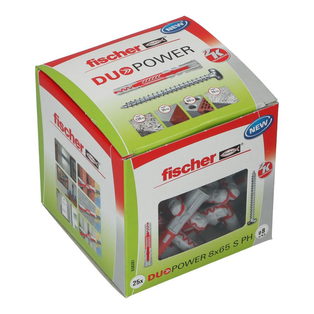 De fischer DUOPOWER heeft een zeer hoge bevestigingswaarde door de 2 componenten: De grijze component van kwalitatief hoogwaardig nylon activeert, afhankelijk van het bouwmateriaal, automatische het optimale werkingsprincipe (spreiden, tikken, knopen) voor het optimaal houvast. De expansievleugels van de rode component ondersteunen de betrouwbare spreiding en biedt extra veiligheid voor de grijze component. De schroef gewoon indraaien en tot slot goed „aantrekken“. De schroef niet de vast aandraaien. De bij de kop aangebrachte rand voorkomt, dat de plug in het boorgat glijdt.