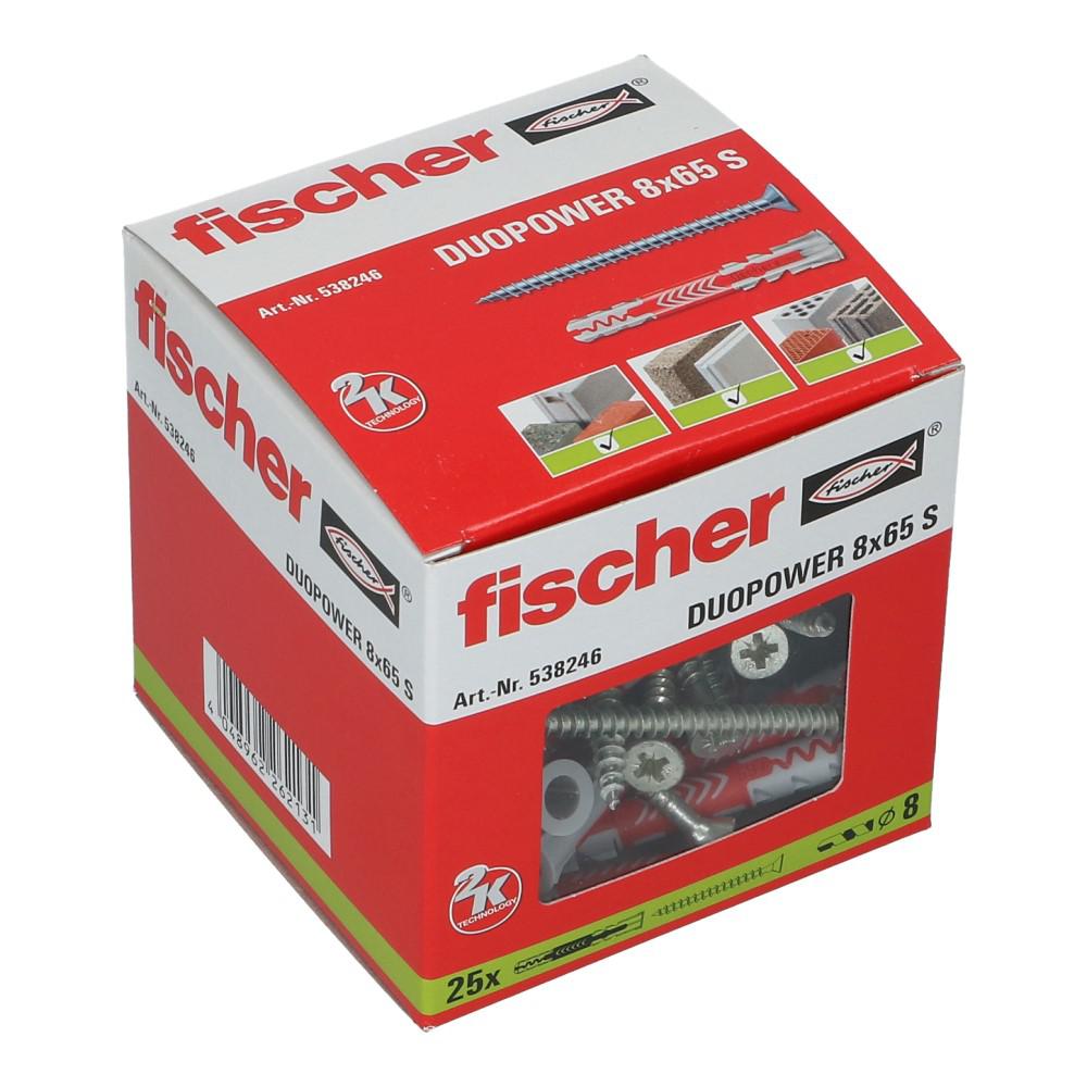 De fischer DUOPOWER heeft een zeer hoge bevestigingswaarde door de 2 componenten: De grijze component van kwalitatief hoogwaardig nylon activeert, afhankelijk van het bouwmateriaal, automatische het optimale werkingsprincipe (spreiden, tikken, knopen) voor het optimaal houvast. De expansievleugels van de rode component ondersteunen de betrouwbare spreiding en biedt extra veiligheid voor de grijze component. De schroef gewoon indraaien en tot slot goed „aantrekken“. De schroef niet de vast aandraaien. De bij de kop aangebrachte rand voorkomt, dat de plug in het boorgat glijdt.