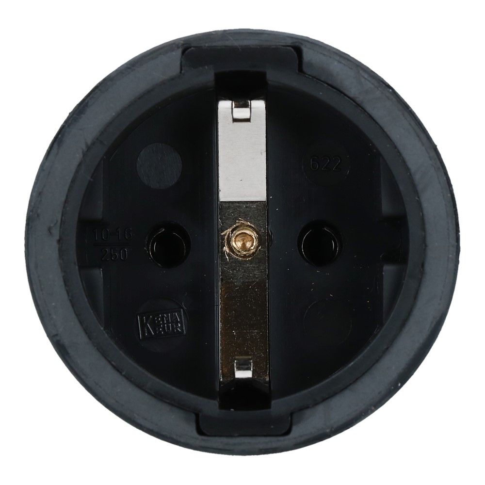 Rubber koppelcontactstop 10/16A, 250V~ 2 polig met randaarde. Conform NEN 1020 en DIN 49440/441. Eigenschappen: rubber mantel | één-schroefsysteem | polyamide binnenwerk | vernikkelde contacten | parallele schroeven met kombi-kop en reeds geopende contacten